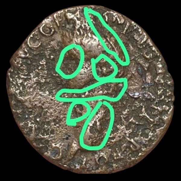 En dicha moneda se observa claramente la trepanación, de exprofeso, de partes significativas del rostro del emperador. Deterioro que incide en una desfiguración cuasi total. A saber: