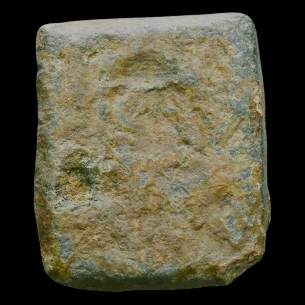 Placa votiva romana en plomo, de forma rectangular con bordes suavemente redondeados y reverso completamente plano, característica de las piezas fundidas en molde simple. El anverso presenta un relieve muy desgastado en el que aún se distingue una figura humana de pie realizando una ofrenda hacia una figura entronizada, probablemente una divinidad o entidad protectora. La escena, aunque esquemática, sigue el motivo típico de la iconografía votiva popular del Imperio, donde el devoto aparece en actitud reverente frente a la deidad. El plomo, material común en exvotos de carácter doméstico o rural, confiere a la pieza un aspecto macizo y una superficie irregular. Con sus 39,6 mm y un peso de 114 g, se inscribe plenamente dentro del tipo de pequeñas placas devocionales depositadas en santuarios locales o espacios de culto como gesto de petición o agradecimiento.