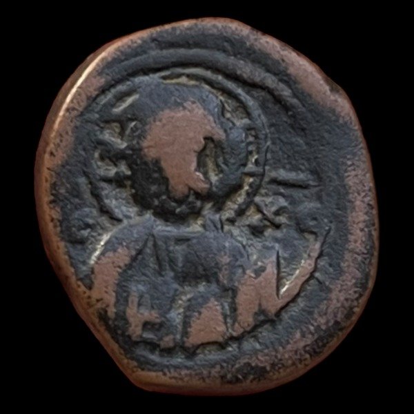 Rev: Busto coronado de Alejo I de frente, sosteniendo globo crucífero y cruz