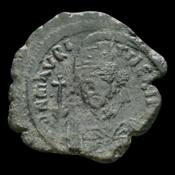 Anv.: D N MAVRC P P AVG, busto coronado, drapeado y con coraza de frente, sosteniendo una cruz sobre globo y escudo
