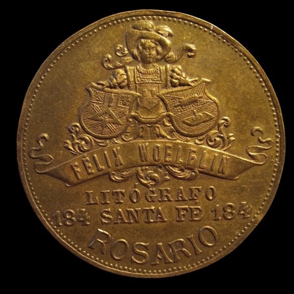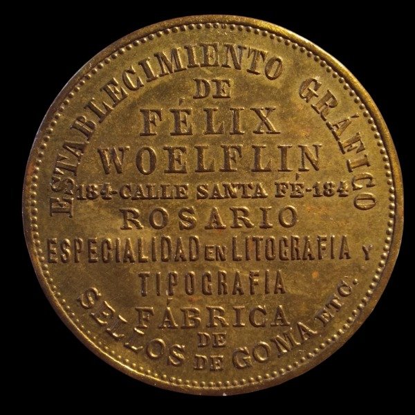Anverso: FÉLIX WOELFLIN / LITÓGRAFO / 184 SANTA FÉ 184 / ROSARIO