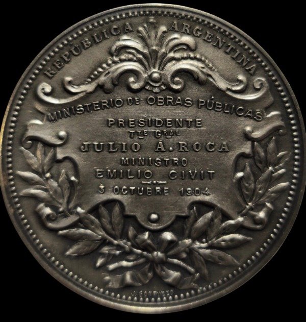 Reverso: REPUBLICA ARGENTINA / MINISTERIO DE OBRAS PUBLICAS / PRESIDENTE / TTE. GRAL. / JULIO A. ROCA / MINISTRO / EMILIO CIVIT / 3 OCTUBRE 1904. Firma: J. GOTTUZZO
