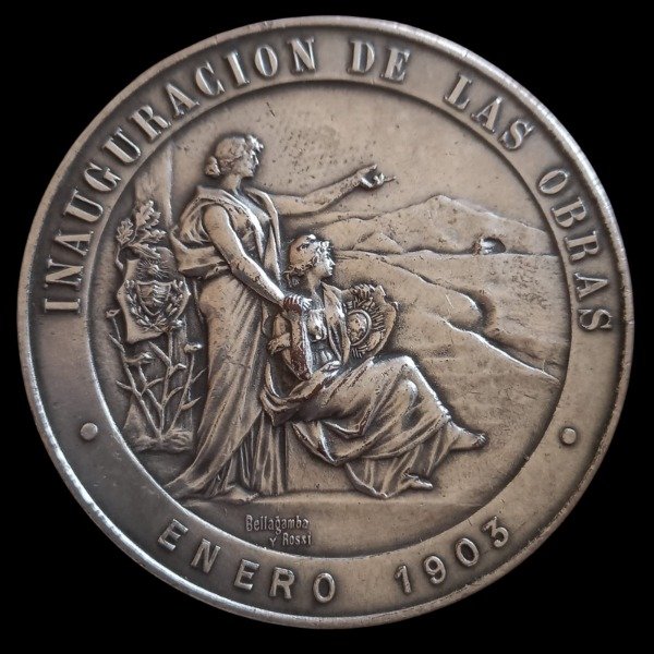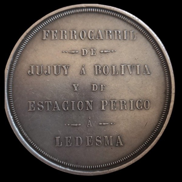 Anverso: INAUGURACION DE LAS OBRAS DEL FERROCARRIL DE JUJUY Á BOLIVIA Y DE ESTACION PERICO Á LEDESMA / ENERO 1903. Firma: BELLAGAMBA / Y ROSSI
