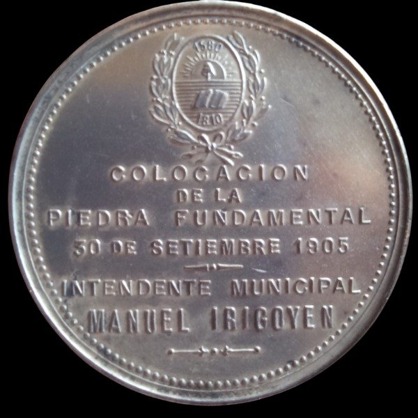 Reverso: COLOCACION / DE LA / PIEDRA FUNDAMENTAL / 30 DE SETIEMBRE 1905 / INTENDENTE MUNICIPAL / MANUEL IRIGOYEN. Campo: 1580 / 1810