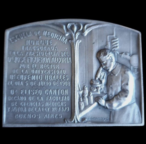 Reverso: ESCUELA DE MEDICINA / Y / MORGUE / INAUGURADA / EN LA PRESIDENCIA DEL / DR. JOSÉ FIGUEROA ALCORTA / POR EL RECTOR / DE LA UNIVERSIDAD / DR. EUGEMIO UBALLES / EL DIA 5 DE JULIO DE 1908 / DR. ELISEO CANTON / DECANO DE LA FACULTAD / DE CIENCIAS MÉDICAS / Y AUTOR DE LA LEY N° 3379 / BUENOS AIRES. Firma: J. GOTTUZZO Y CA.
