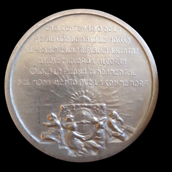 Reverso: EN EL CENTENARIO DE LA / REVOLUCIÓN DE MAYO DE MDCCCX / EL PRESIDENTE DE LA REPÚBLICA ARGENTINA / DR. JOSÉ FIGUEROA ALCORTA / COLOCA LA PIEDRA FUNDAMENTAL / DEL MONUMENTO QUE LA CONMEMORA. Firma: ESC. / L. SALA