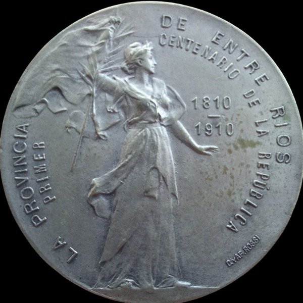 Anverso: LA PROVINCIA / DE ENTRE RIOS / PRIMER / CENTENARIO DE LA REPÚBLICA / 1810 / 1910. Firma: C. Y AF. ROSSI
