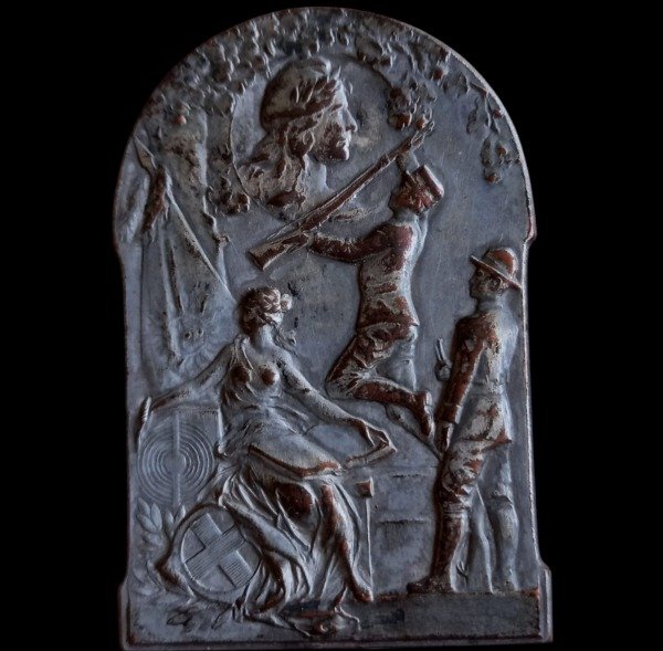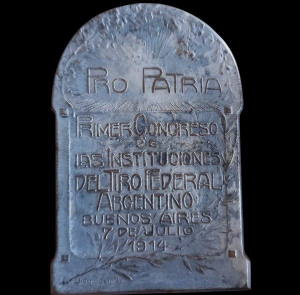 Reverso: PRO PATRIA / PRIMER CONGRESO / DE / LAS INSTITUCIONES / DEL TIRO FEDERAL / ARGENTINOS / BUENOS AIRES / 7 DE JULIO / 1914. Firma: J. GOTTUZZO Y CA.