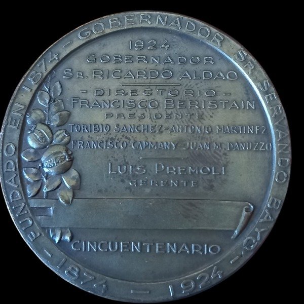 Reverso: FUNDADO EN 1874 - GOBERNADOR SR. SERVANDO BAYO / 1874 - 1924 / 1924 / GOBERNADOR / SR. RICARDO ALDAO / - DIRECTORIO - / FRANCISCO BERISTAIN / PRESIDENTE / TORIBIO SANCHEZ - ANTONIO MARTINEZ / FRANCISCO CAPMANY - JUAN M. DANUZZO / LUIS PREMOLI / GERENTE / CINCUENTENARIO